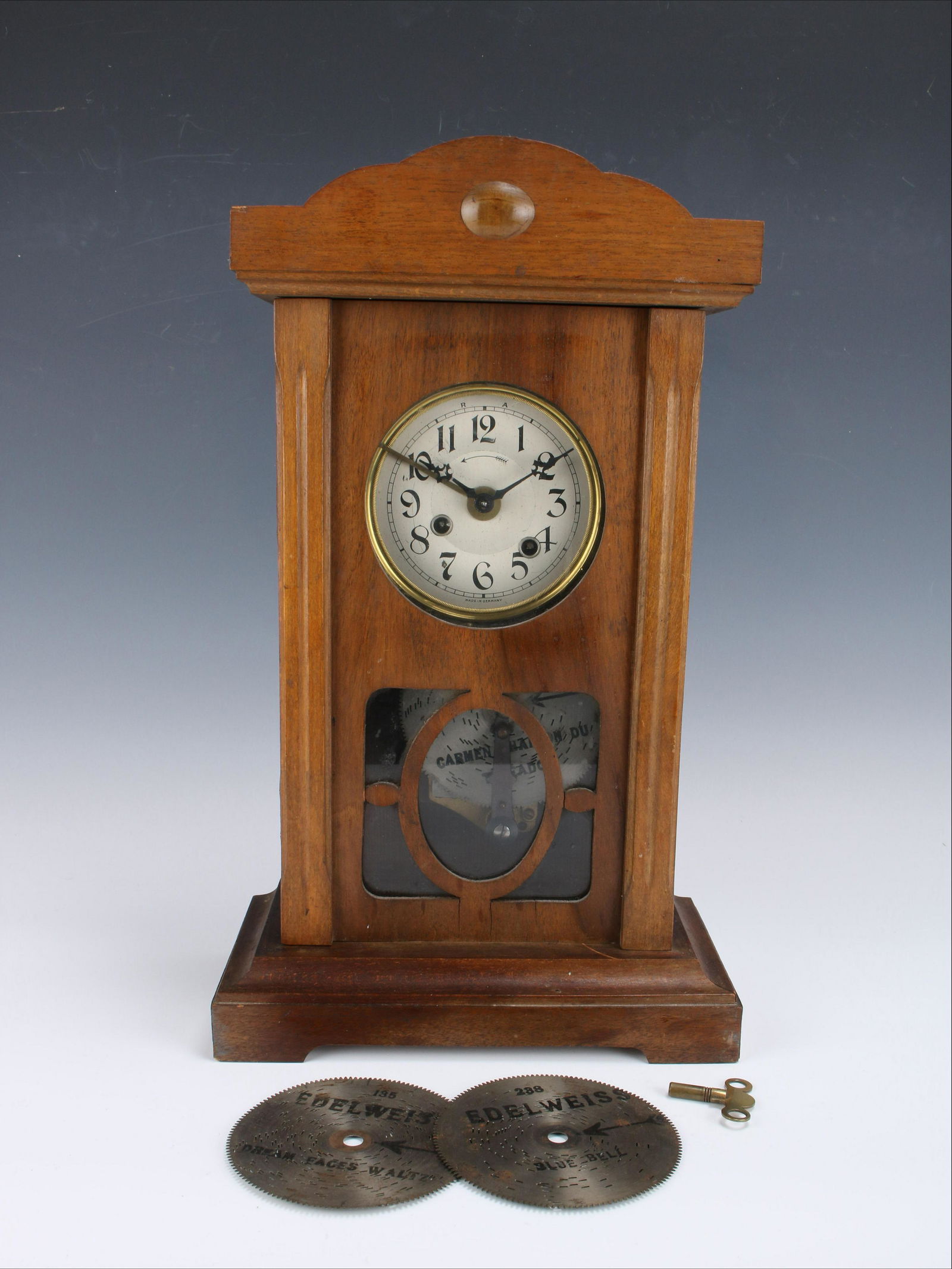 GERMAN MUSIC BOX MANTEL CLOCK WITH INTERCHANGEABLE DISCS
