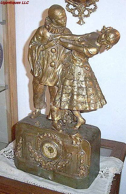 SoldGerman Enamel Musical Mantle ClockGerman Enamel Musical Mantle Clock. German clock with signed face featuring two revolving dancers, clock frame with enamel details. Measures 10 inches x 9 inches x 6 inches.See Sold Price
