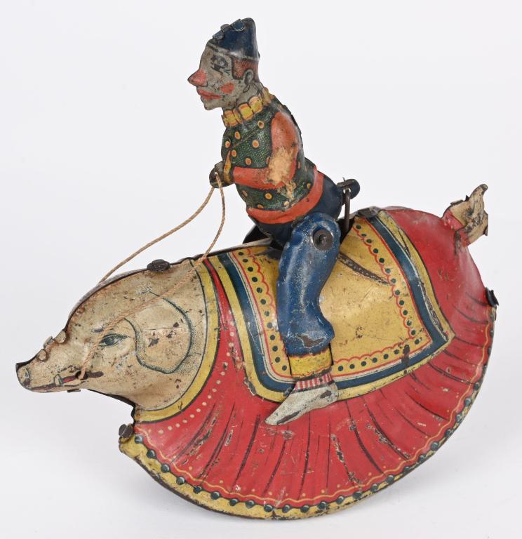 GERMAN TIN WINDUP CLOWN ON PIG
