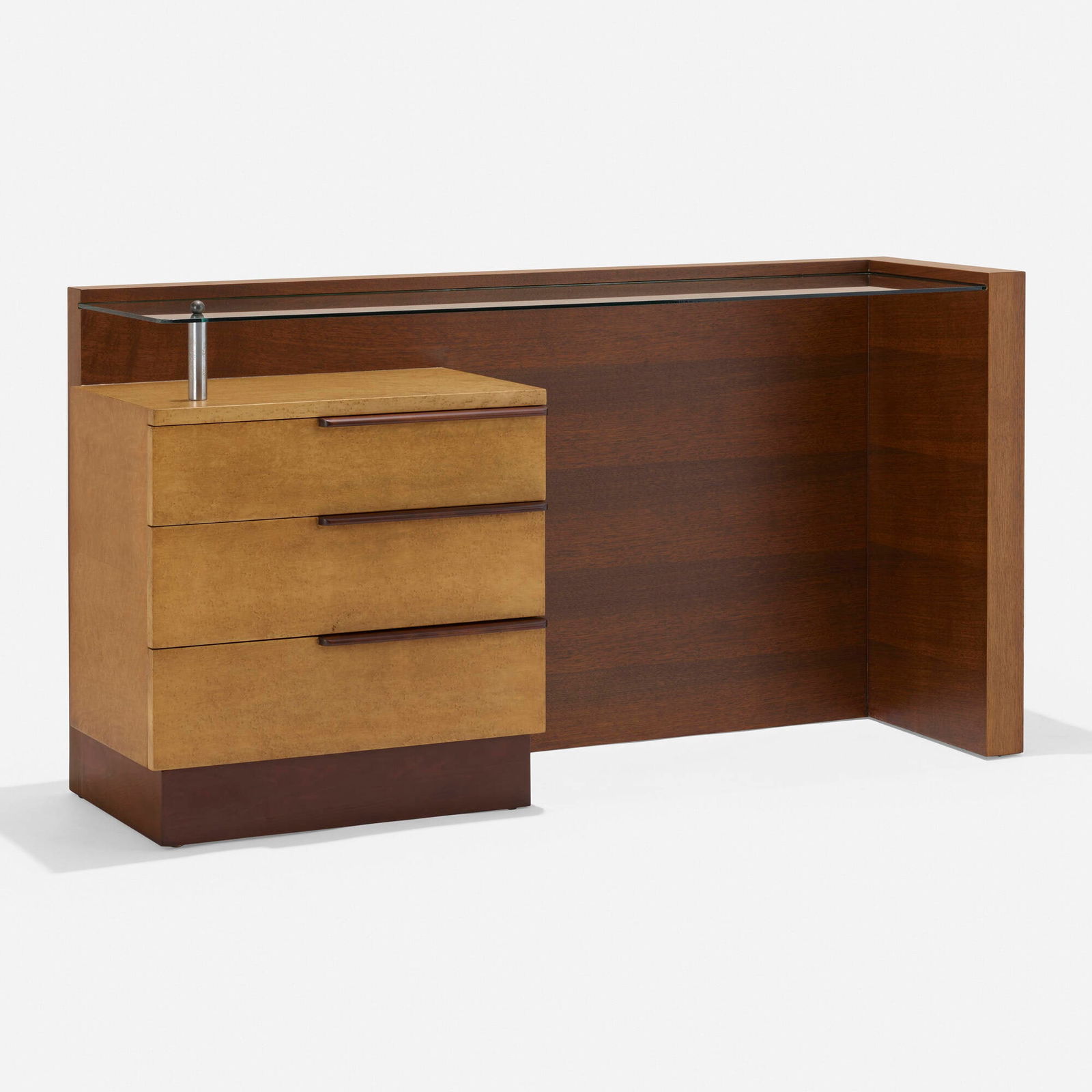 SoldGilbert Rohde Drop Front Desk, Model# 3425Gilbert Rohde Drop Front Desk, Model# 3425, Herman Miller, USA, 1940. East India Laurel, matte chrome plated steel, lacquered wood. Featuring three drawers, one door concealing an adjustable shelf andSee Sold Price