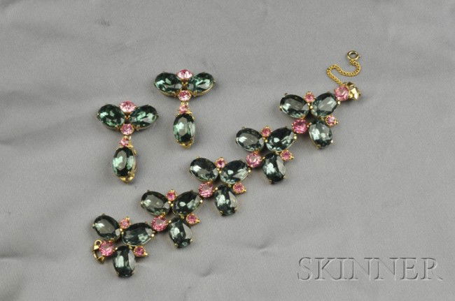 Gilded Metal and Colored Paste Bracelet and Earpend