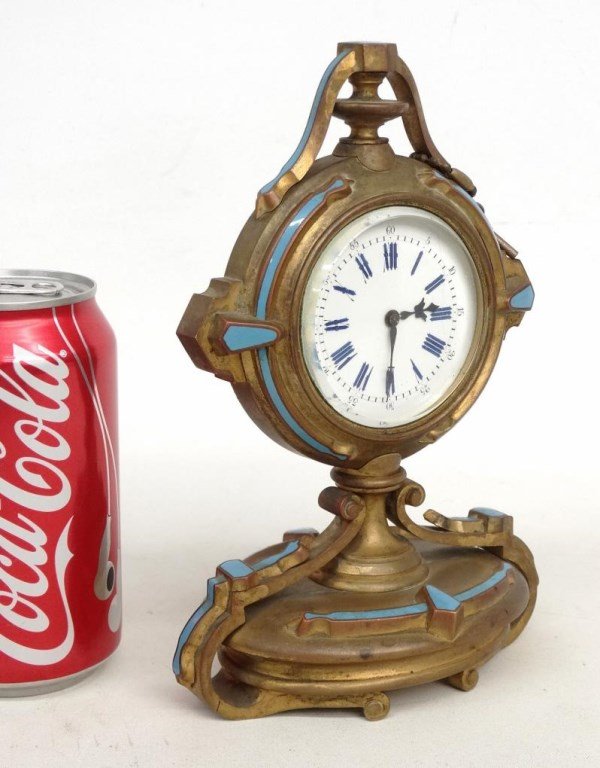 SoldAntique European gilt bronze & enamel clockAntique European gilt bronze & enamel clock. 3 3/4" H x 2 5/8” W. Shipping in USA is $ 20.00. International bidders ask for shipping before bid.See Sold Price