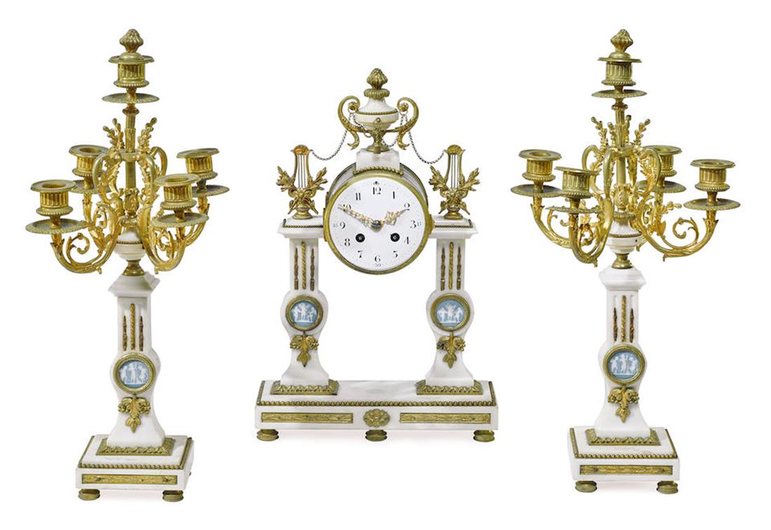 (3) EMPIRE STYLE BRONZE & MARBLE MANTEL CLOCK & CANDELABRA GARNITURE SETFeb 22, 2026(3) SEVRES STYLE PORCELAIN & BRONZE MANTEL CLOCK & CANDELABRA GARNITURE SETFeb 22, 2026(3) LOUIS XVI STYLE ORMOLU-MOUNTED ROUGE MARBLE CLOCK GARNITURE SETFeb 22, 2026(3) FRENCH LOUIS XVI STYLE ORMOLU-MOUNTED MARBLE CLOCK & CANDELABRA GARNITURE SETFeb 22, 2026(3) FRENCH MARBLE, SILVERED BRONZE & ORMOLU MANTEL CLOCK & GARNITURE SETFeb 22, 2026Antique Art Nouveau Brass Ornate Mantle Clock and 2 Candelabras - Garniture SetLouis XVI Style Gilt Bronze Mounted Blue Turquin Marble Three Piece Clock Garniture Paris Circa 1875Feb 13, 2026A late 19th century French gilt bronze mounted white marble clock garniture 3Japy Freres Gilt Bronze 3-Piece Mantel Clock.2 days LeftClock Garniture Mantelpiece, Impressive 21 inches tall, Gilt Bronze, 19th CenturyFeb 15, 2026Gilt Bronze Garniture Louis Xv StyleFeb 26, 2026FRENCH GILT BRONZE AND MARBLE 'LYRE' SHAPED CLOCK GARNITURE, 19TH CENTURYFeb 15, 2026French Figural Gilt Bronze Mantel Clock and Candelabra GarnituresFeb 13, 2026A FRENCH NEOCLASSICAL MARBLE AND BRONZE MANTEL CLOCK GARNITURE, 19TH CENTURYFeb 15, 2026A large and antique French Rococo style gilt bronze mythological figural decorated mantel clock setFeb 24, 2026L. Marti et Cie 3-Piece White Marble Mantle Clock.2 days Left