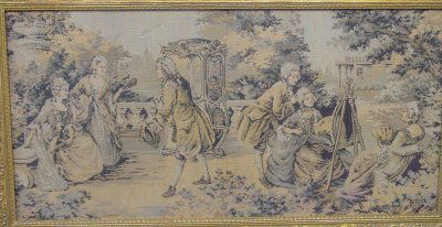 Gilt framed machine made tapestry courting scene
