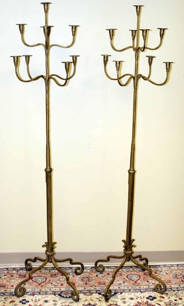 GILT IRON NINE LIGHT FLOOR CANDELABRUM, PAIR,