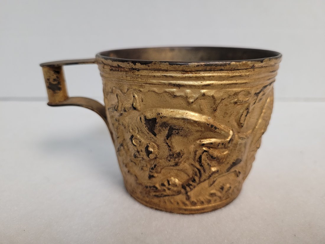 SoldA CHINESE TANG STYLE GILT METAL CUP, the lobed sidesA CHINESE TANG STYLE GILT METAL CUP, the lobed sides with figural designs above raised lappets on a stipple ground, 3.25in diameter & 4in long including handle.See Sold Price