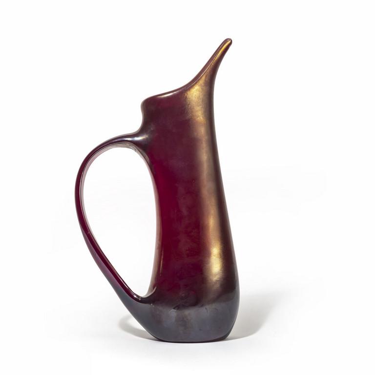 SoldGiorgio Ferro Pitcher, from the 'Anse Volanti' series, 1950sGiorgio Ferro Pitcher, from the 'Anse Volanti' series, 1950s Iridescent coloured glass. 30.5 x 13.5 x 13.7 cm Produced by A.V.E.M, Murano, Italy. Footnotes: Literature 'Murano alla Biennale', DomuSee Sold Price