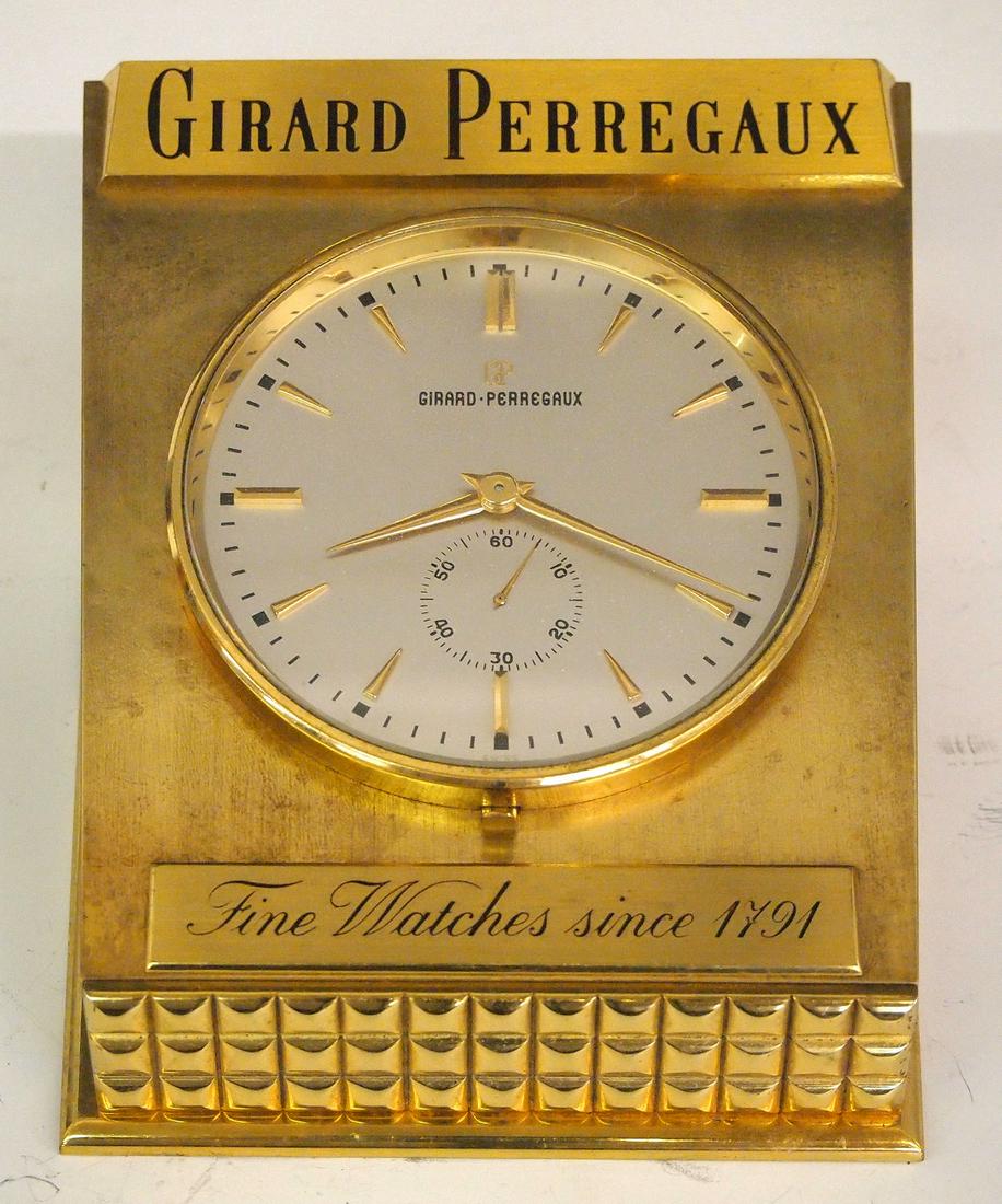 SoldA Girard Perregaux desk or table clock with electric remontoireGirard Perregaux, Switzerland, a mid 20th century desk or table clock with electric remontoire, gilt, trapezoidal case with sloping front, and decorated with rows of flat topped pyramids, signed, silvSee Sold Price