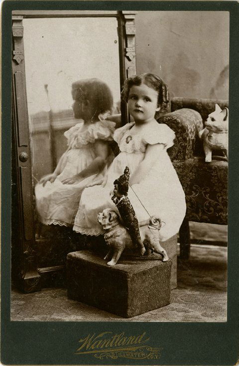 GIRL, MIRROR, CERAMIC KITTY, PUPPET ON CERAMIC DOG