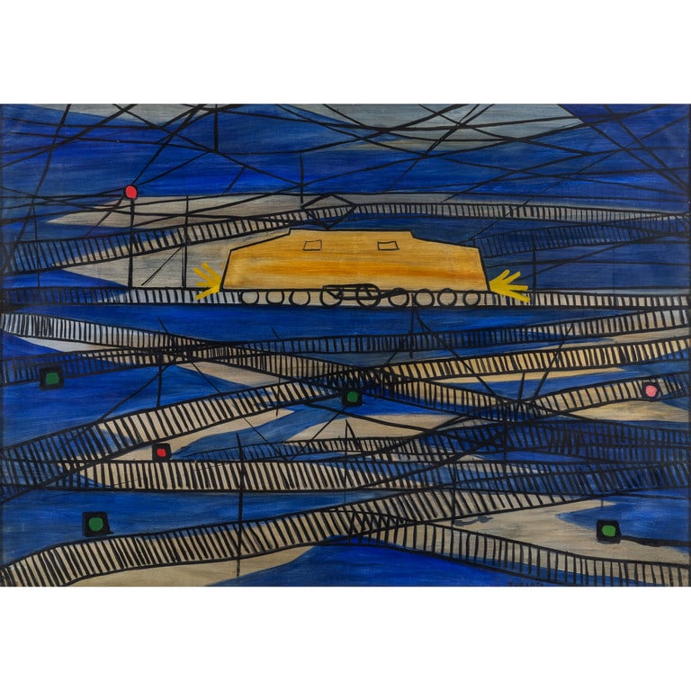 SoldKarl Adser (1912 - 1995) Oil on Canvas painting view through a large industrial structure, craneKarl Adser (1912 - 1995) Danish, Oil on Canvas painting depicting a view through a large industrial structure, likely a crane or gantry, overlooking a small town or settlement nestled in a valley withSee Sold Price