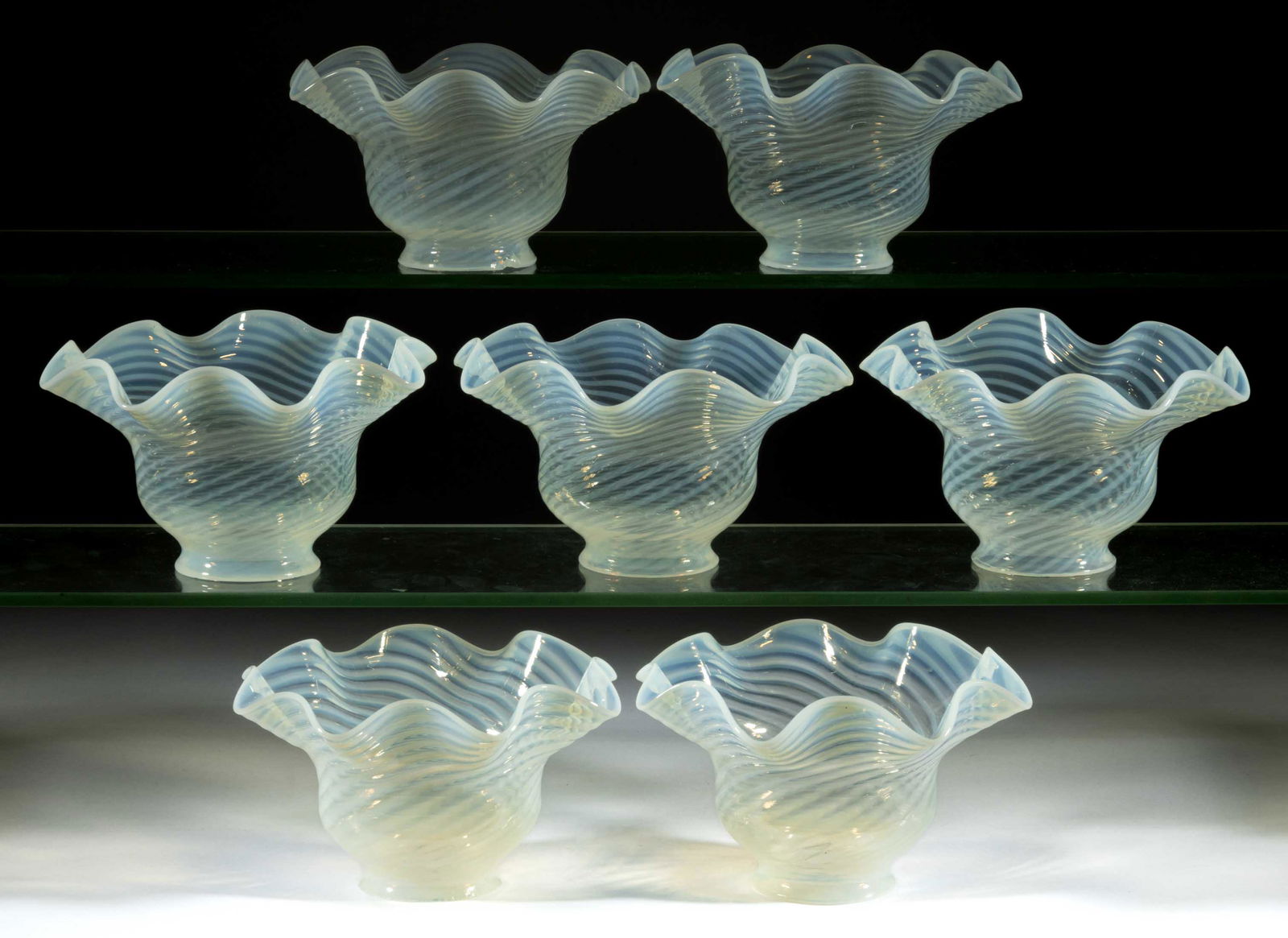 OPALESCENT SWIRL GLASS KEROSENE LIGHTING SHADES, LOT OF SEVEN