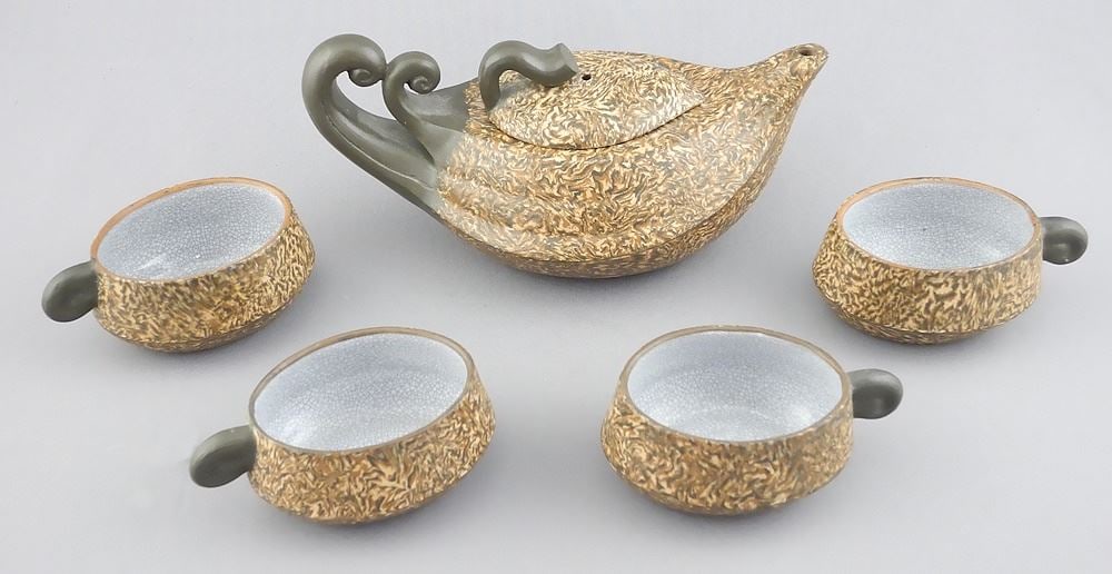 Glazed Yixing Ware Tea Set, Pot 6 3/8"L.