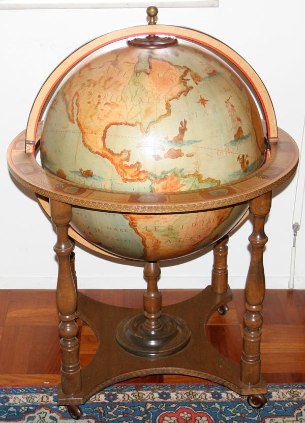 GLOBE FORM PORTABLE BAR ON A WALNUT FRAME,