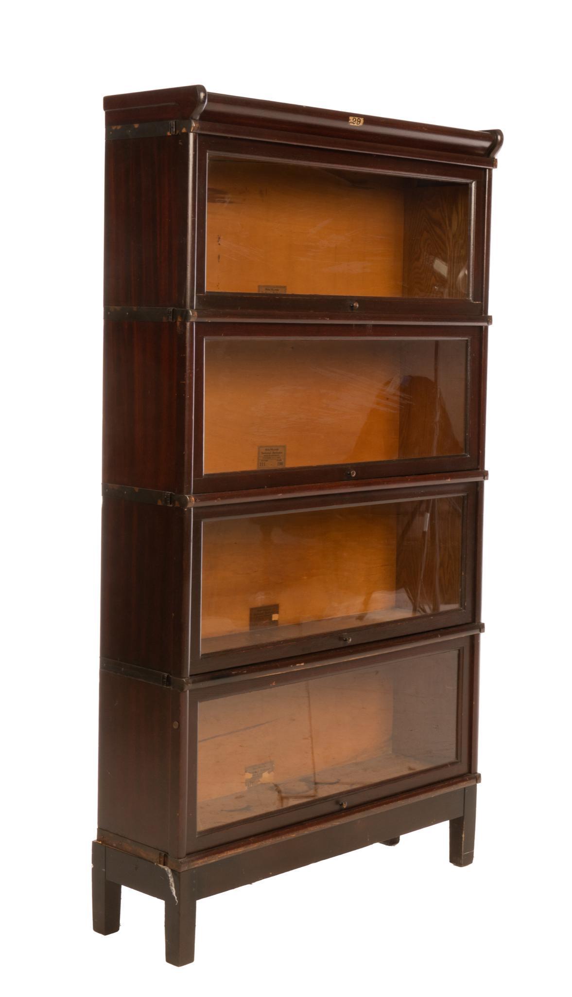 SoldGLOBE-WERNICKE SECTIONAL BARRISTER BOOKCASEComposed of four stacked sections, with crown piece and base. Pattern 813, Grade 3098 1/2. Dimensions: H 71" x W 34.5" x W 11.25" ; single section measures 15" tall. Condition: Great candidate for refSee Sold Price