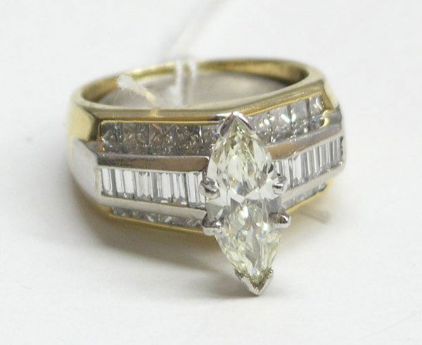 14K gold and diamond ring set with 3 marquis cut diamonds. Made as 2 parts to be worn together or as14K gold and diamond ring set with 3 marquis cut diamonds. Made as 2 parts to be worn together or as one. Approx. 1CTW. Marked on diamond ring 14K and maker's mark. Total weight 5.7 grams. Ring size 5