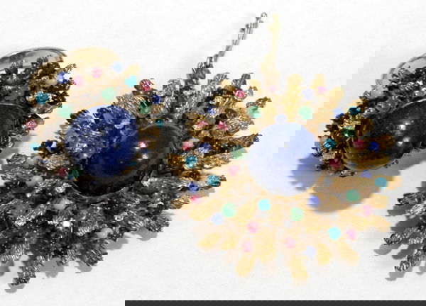 Sold1960s 18k Gold Diamond Ruby Emerald Sapphire RingMETAL: 18k Gold. MEASUREMENTS: Ring size - 6.75, ring top is 26mm in diameter, each flower element is movable/spinning. GEMSTONES: Ruby, Sapphire, Emerald, Diamonds approx. 0.20ctw. MARKED: 435AL, 750See Sold Price