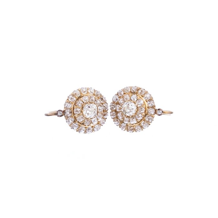 SoldPair of Art-Deco 14 kt gold earrings with diamondsPair of Art-Deco 14 kt gold earrings with diamonds , WG 585/000, german approx. 1925, centered old cut diamonds, platin setting, total approx. 1.60 ct surrounded by diamonds total approx. 1.80 ct, totSee Sold Price