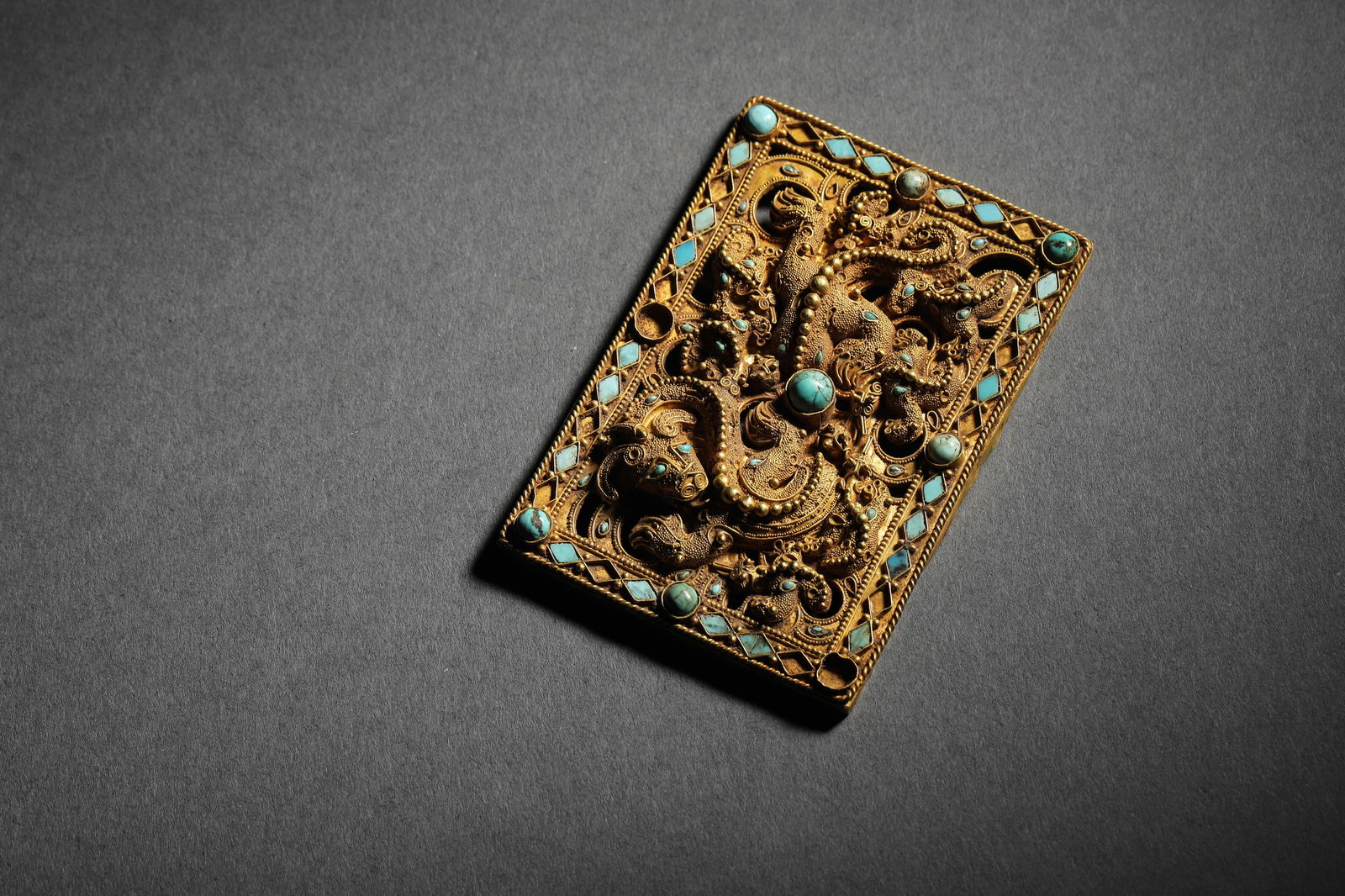 Gold Inlaid Turquoise Relief Tiger Pattern Plaque
