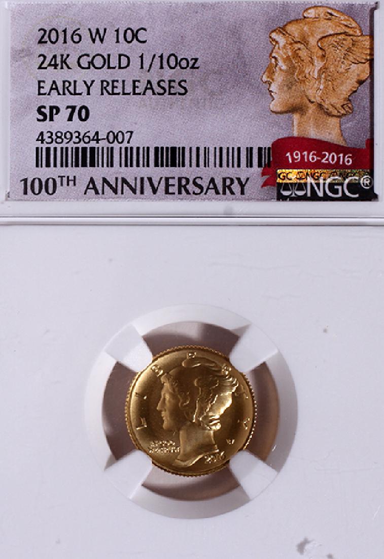 2016-W 24K 1/10oz Gold Mercury Dime NGC SP70