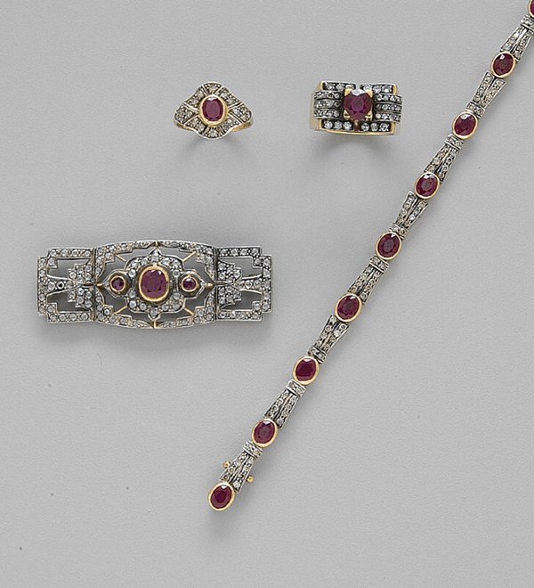 SoldTHREE (3) RUBY AND DIAMOND BRACELET & EARRING SETThree (3) Ruby And Diamond Bracelet & Earring Set: The Bracelet And Earrings Comprised Of Rubies And Diamonds inlaid On A 14K White Gold Sterling Silver Setting, With A Total Weight Approximately 110CSee Sold Price