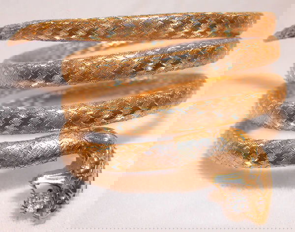 AN ANTIQUE VICTORIAN SAPPHIRE, GEMSTONE AND DIAMOND SNAKE BANGLE in yellow gold, designed as two coiAN ANTIQUE VICTORIAN SAPPHIRE, GEMSTONE AND DIAMOND SNAKE BANGLE in yellow gold, designed as two coiled snakes, one snake's head set with a cushion cut red stone in a surround of rose cut diamonds, th