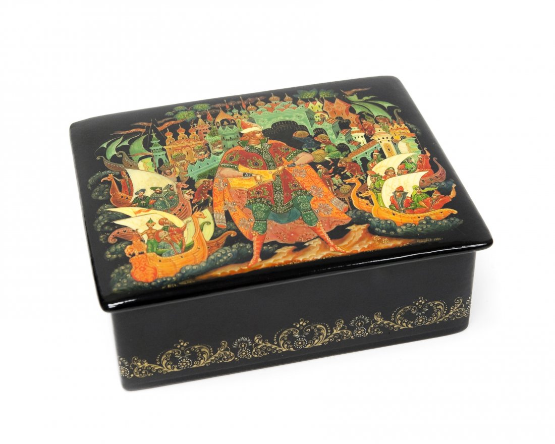 SoldGolubev Palekh Russian Lacquer Box.Golubev Palekh Russian lacquer box. King and his subjects. Signed. (1 3/4", 4 3/4" x 3 3/4").See Sold Price