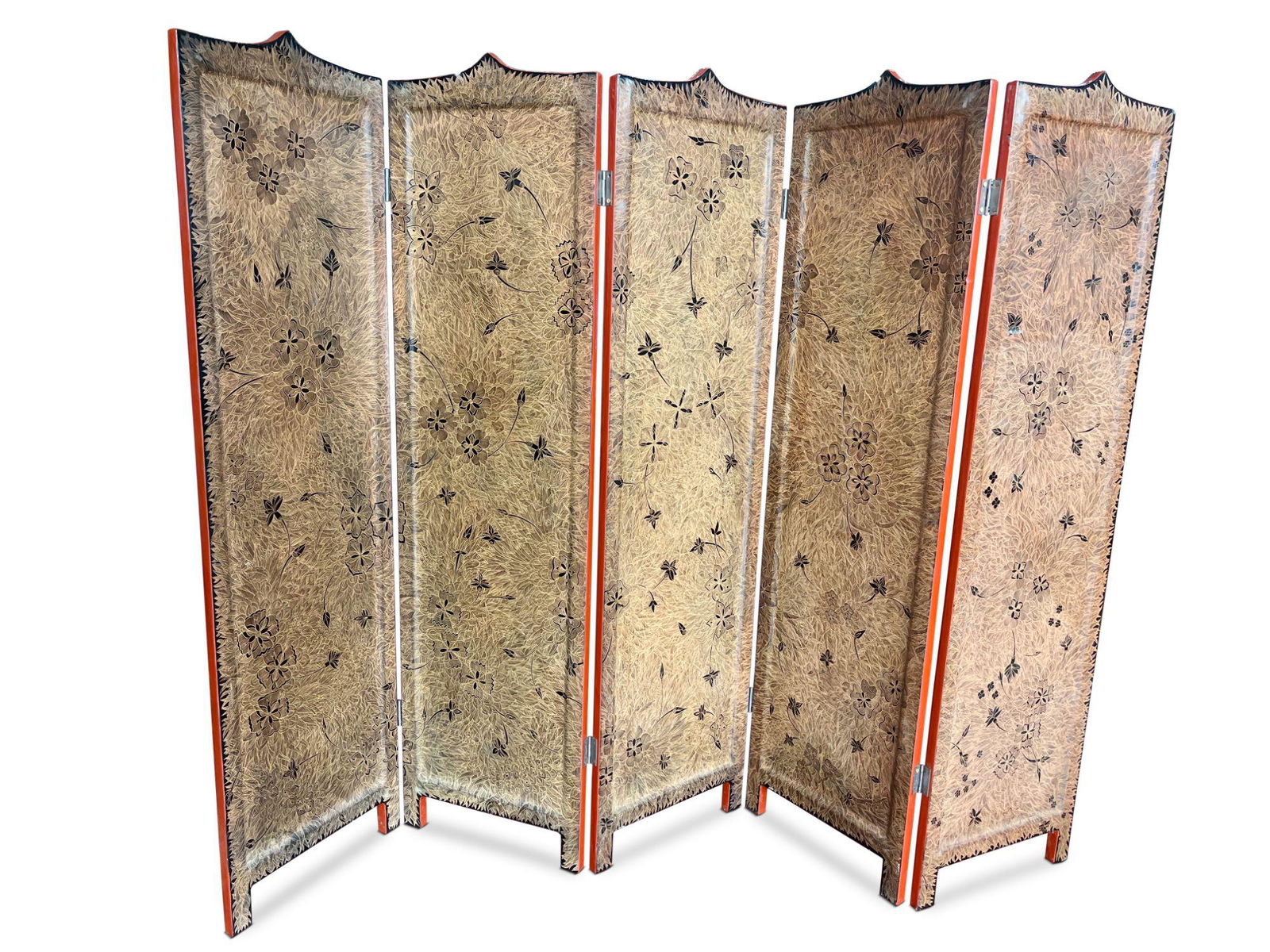 Good Burmese Red Lacquer Five Panel Screen,