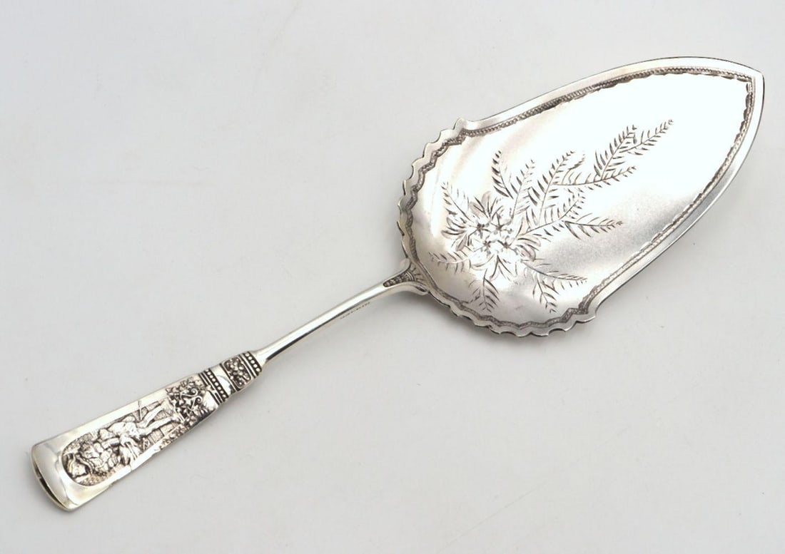 SoldTwo Victorian Bright Cut Silver Pastry ServersTwo Victorian pastry servers, one marked F.F. Allen sterling with Aesthetic Movement butterfly decoration, and one coin silver 'Olive' pattern with reticulated rococo motif, dated May 30, 1860 9", 10.See Sold Price