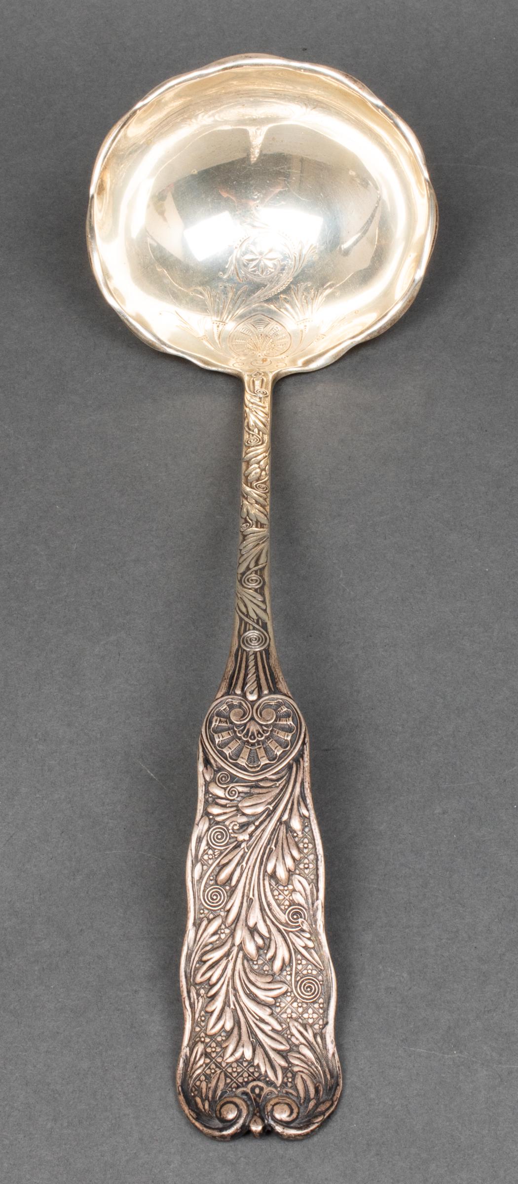 Sold1885 GORHAM STERLING SILVER SAINT CLOUD LADLEA large sterling silver punch ladle made by Gorham in 1885. There are shells, bamboo and foliate themes. It measures 13.5" long and weighs 7.7 OZT (242 grams).See Sold Price