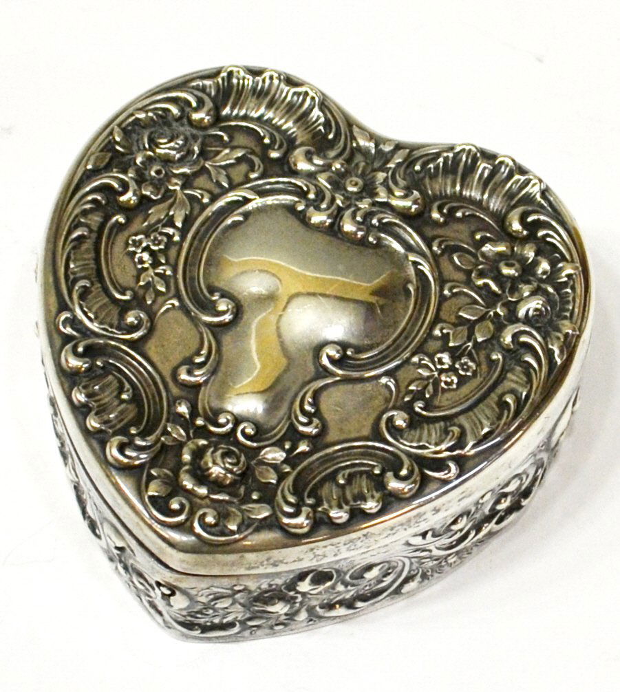 SoldBirmingham Sterling Silver Heart Box 1900Birmingham sterling silver repousse heart hinged lidded tinket box. 2.5"L x 2.25"W x 5"H. Weight: 34 grams. Condition: Very Good. Please examine all photos closely. Contact C. Biddle Auction Gallery fSee Sold Price