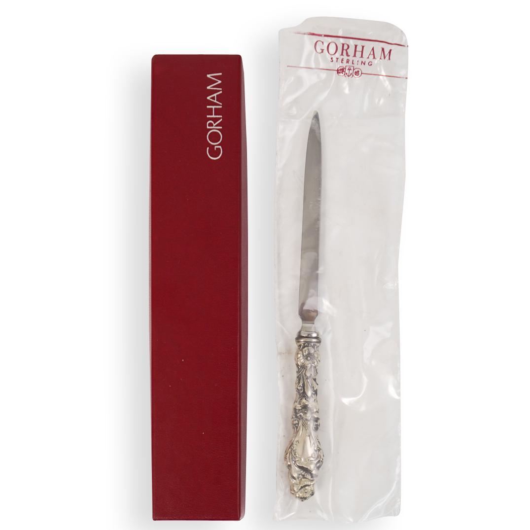 SoldGorham Sterling Silver Letter OpenerDESCRIPTION: A sterling silver letter opener by Gorham in a floral design handle with a stainless steel top. Never used, comes in original wrapper and with original box. CIRCA: 20th ct ORIGIN: USA DIMSee Sold Price