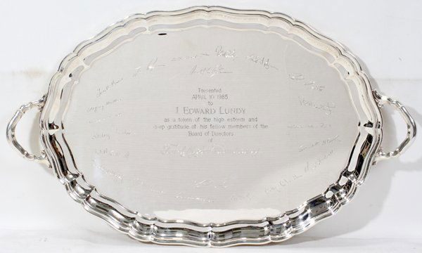 GORHAM STERLING TRAY PRESENTED TO J. LUNDY