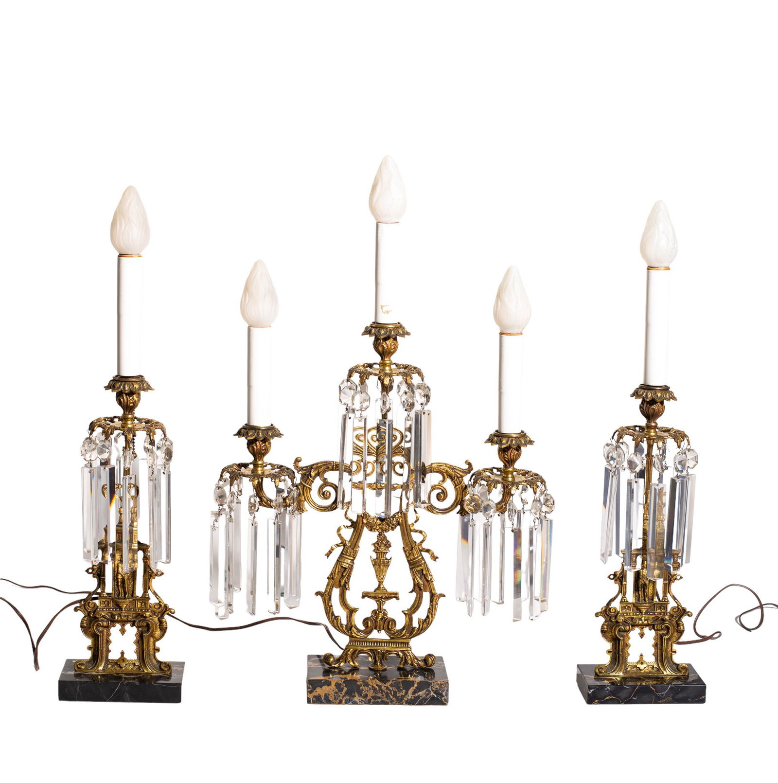 SoldSet of Rococo Revival Girandole CandelabraCast bronze and glass pendants, set upon white marble bases. With two single light candelabra flanking a three light candelabra. Marked Dietz Brothers.Dimensions: H 17 x W 16 x D 3 inchesNOTE: VariousSee Sold Price