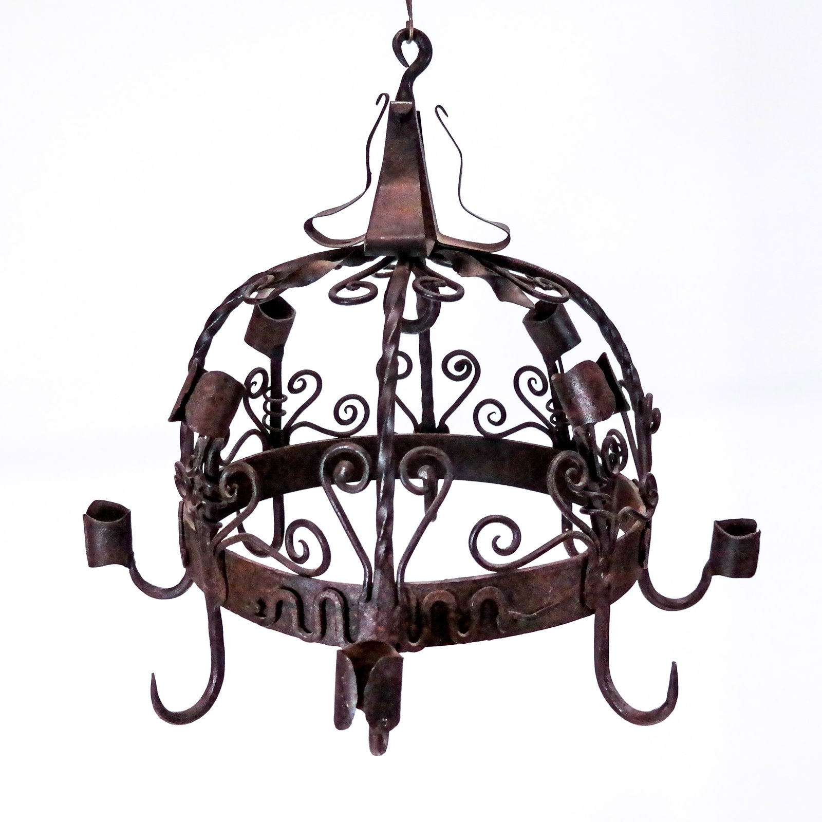 SoldGOTHIC STYLE WROUGHT IRON EIGHT-LIGHT CHANDELIERGothic style wrought iron eight-light chandelier, early 20th c., hanging corona with applied flowers, issuing eight lights, with four hanging hooks, in need of wiring, approx 52"h, 49"diam Start PriceSee Sold Price
