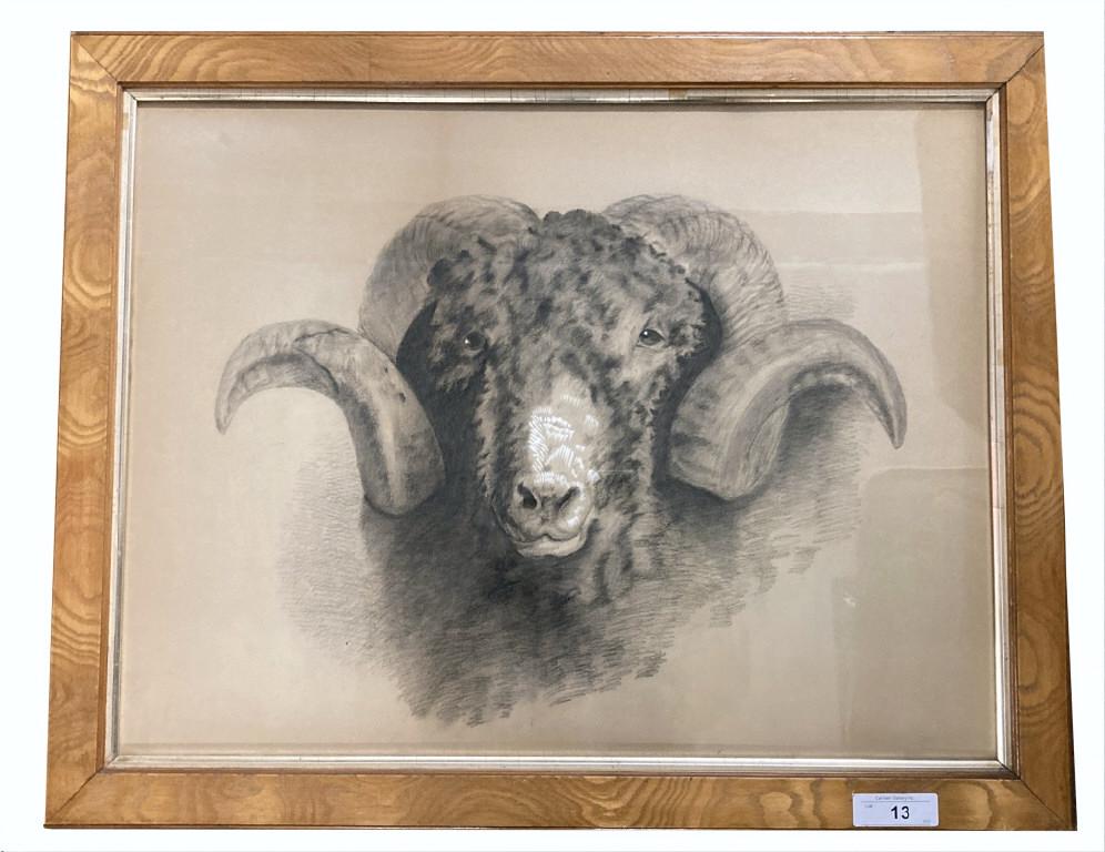 GRAPHITE ON PAPER "RAMS HEAD" HEIGHTENED W/ CHALK 22" X