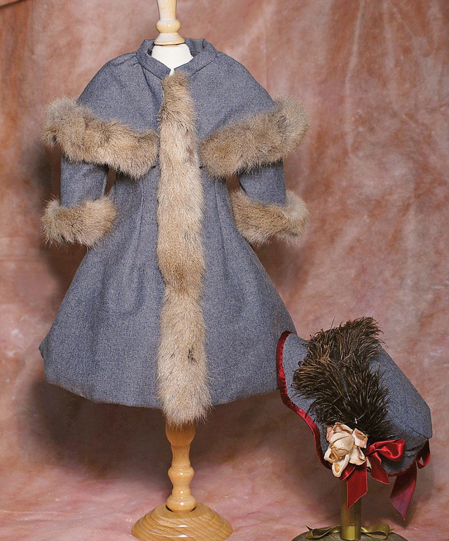 GRAY WOOL DOLL COAT WITH MATCHING BONNET. 6 ½”