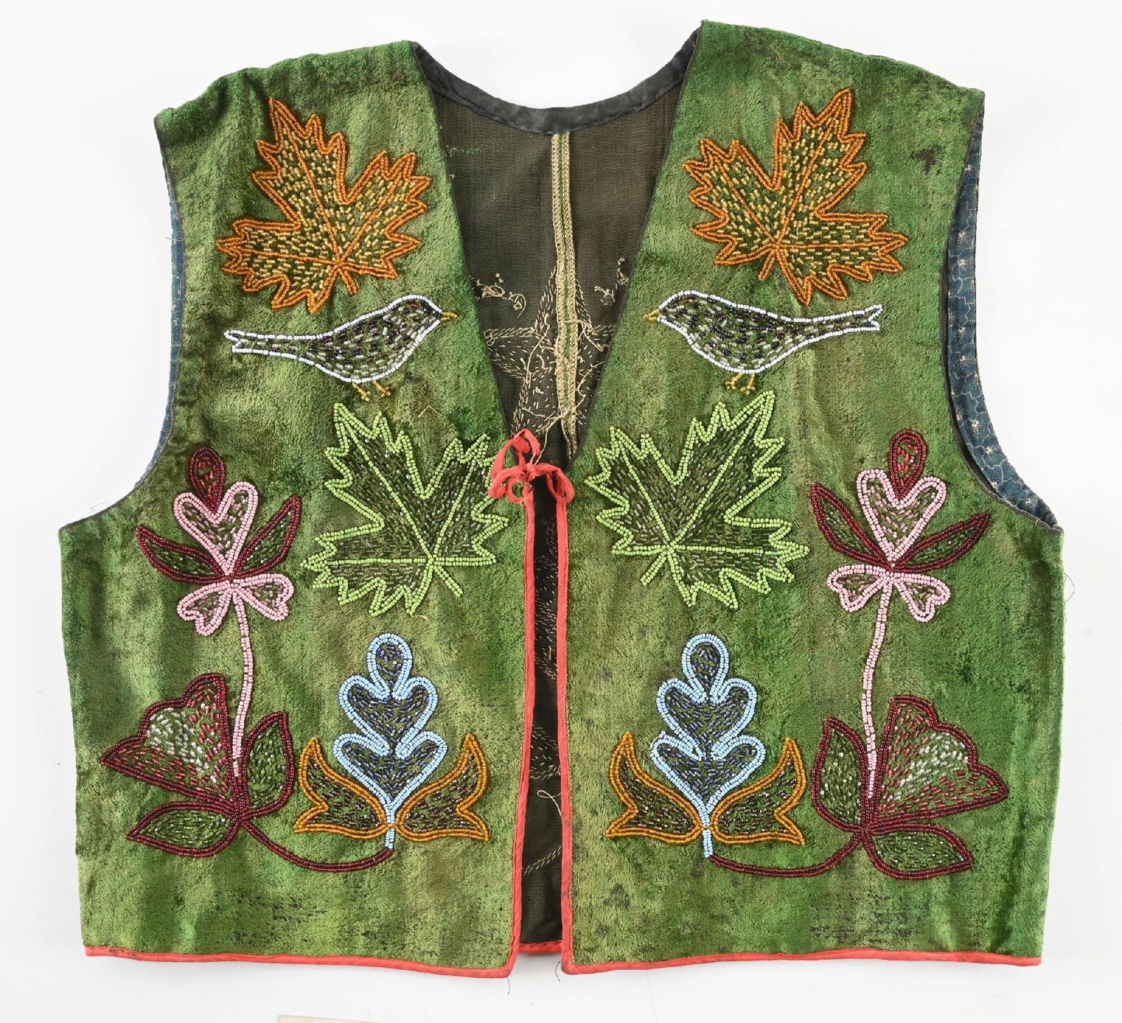 GREEN BEADED VEST WITH BIRDS AND LEAF PATTERN IN SHADOW BOX