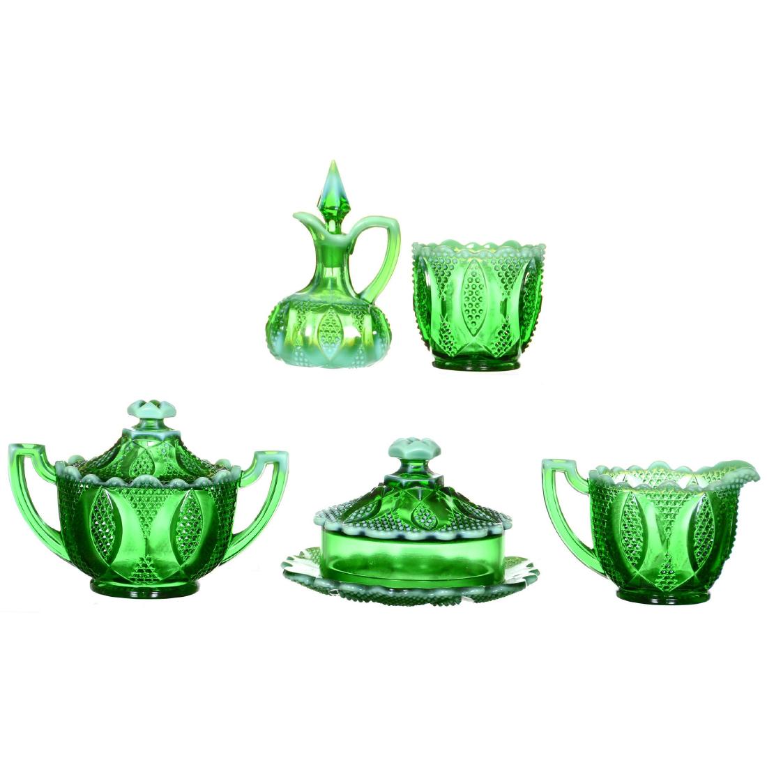 Green Opalescent Pattern Glass Table Set with Cruet
