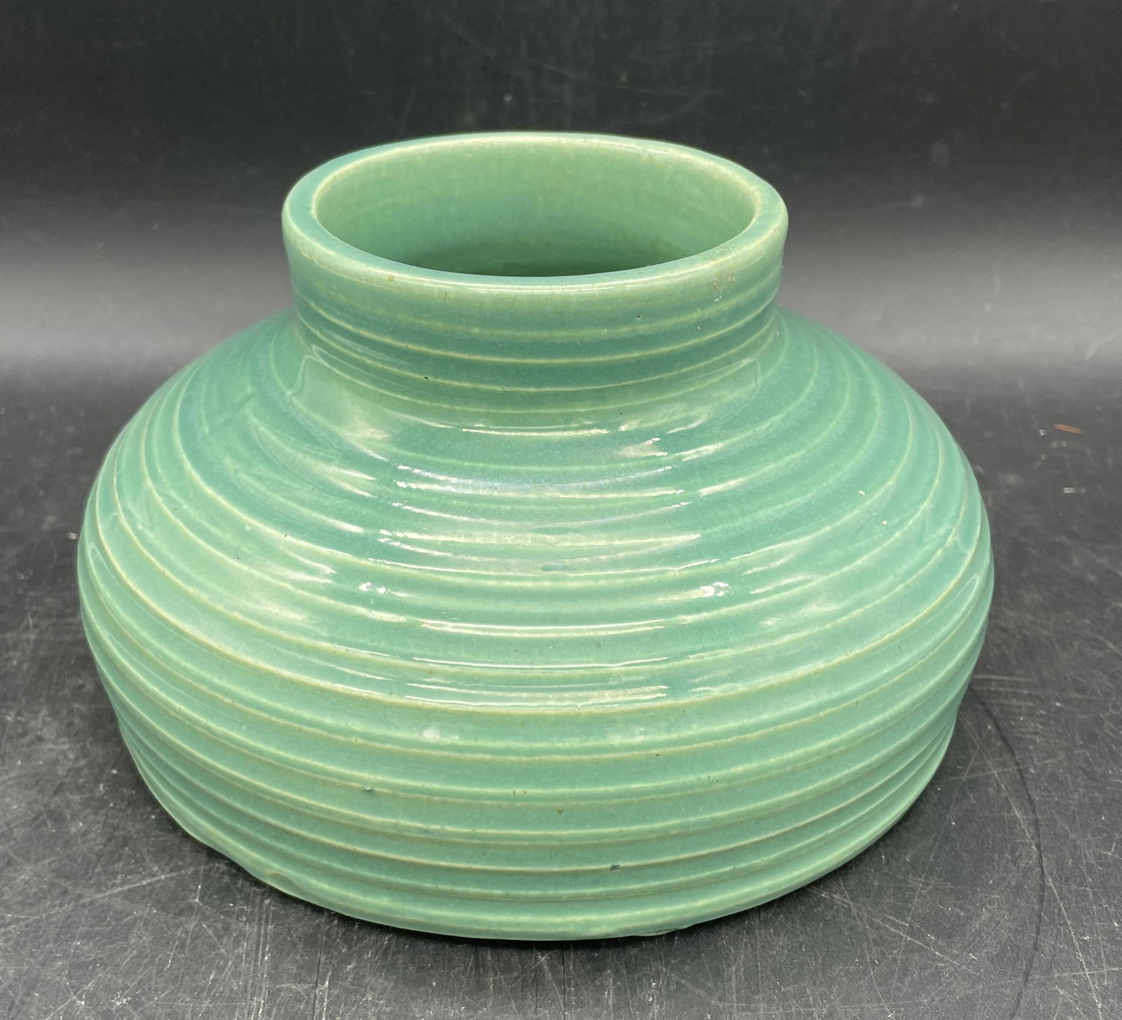 Green Ribbed Studio Art Pottery Vase Marked