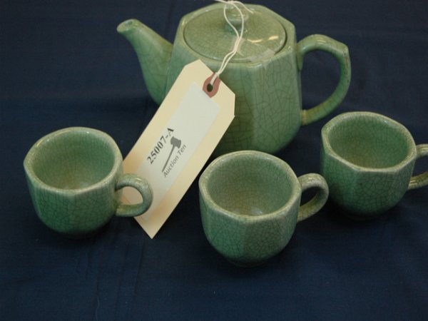 Sold(31pc) Fry Foval Jade Green Tea SetUnmarked (1) Large Tea Pot 8" (1) Small Tea Pot (10) Berry Bowls (6) Demitasse Cups (10) Tea Cups (1) Sugar (1) Creamer (1) Trivet Condition: The largeSee Sold Price