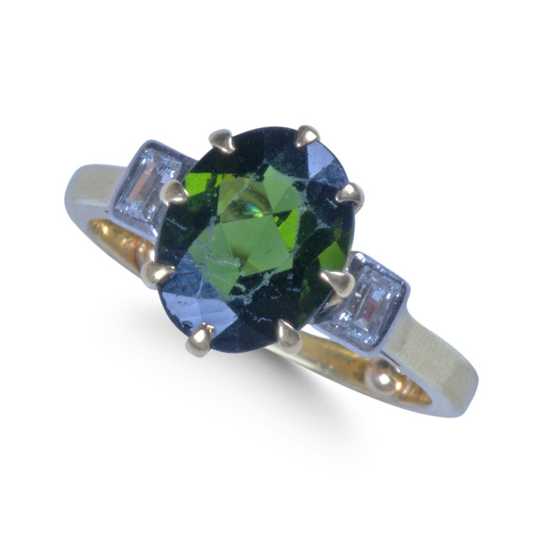 GREEN TOURMALINE AND DIAMOND THREE STONE RING.
