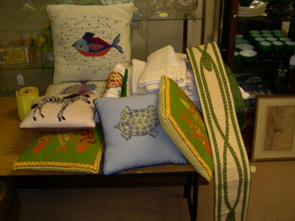 GROUP ASSORTED NEEDLEPOINT PILLOWS BELL PULL ETC