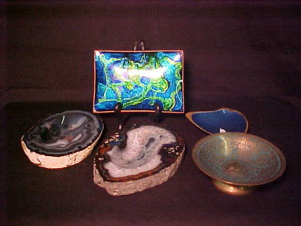 GROUP ENAMEL BRASS AGATE ASHTRAYS ETC