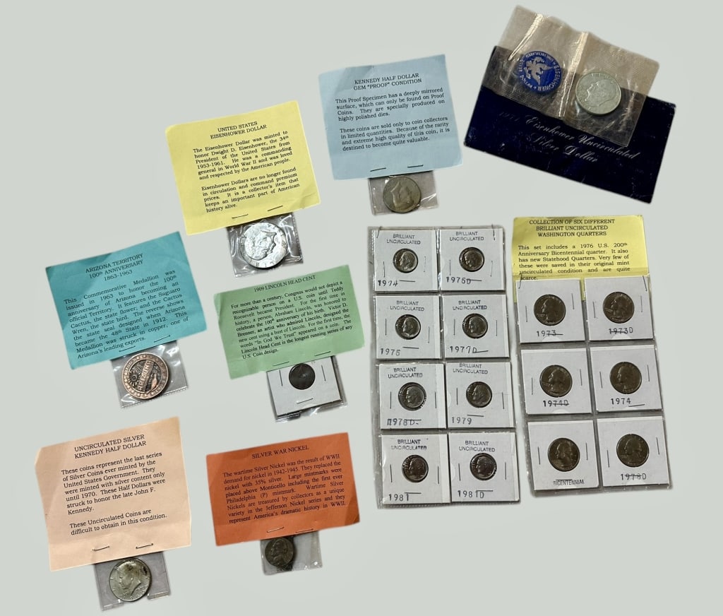 [11 Coins] 1881-1963 U.S. Coin Lot 1C-$1Mar 26, 2026Opportunity Lot- US and Foreign Coins4 days LeftLOT OF US MINT COLLECTIBLE COINS5 days LeftLOT OF US SILVER DIMES, ETC.5 days Left1979-1999 Collection of Dollar and Quarter CoinsApr 16, 20261977-79 US Mint Uncirculated Coin Sets, Denver PhiladelphiaMar 29, 2026US A Collection of American Mint Archival Replica CoinsApr 16, 2026(15) Various 1920s - 1970s US Coins - LooseMar 29, 2026US 1932-1964 Silver Coin Collection, 90% SilverApr 16, 2026ASSORTED US COINS, MOST PENNIES5 days LeftINB Assorted Lincoln Pennies, 1920s-2000sMar 29, 2026A Lot of US, FR, and AT Silver and Clad Coins, 1901-1991Apr 16, 2026Mixed US Coins, 1967 Proof, Eisenhower & Susan BGrouping of Various Graded United States Silver Half Dollar Coins3 days LeftGrouping of Highly Graded United States Coins3 days LeftA Collection of United States Lincoln Cents, Washington Quarters, and a Sacagawea DollarMar 26, 2026