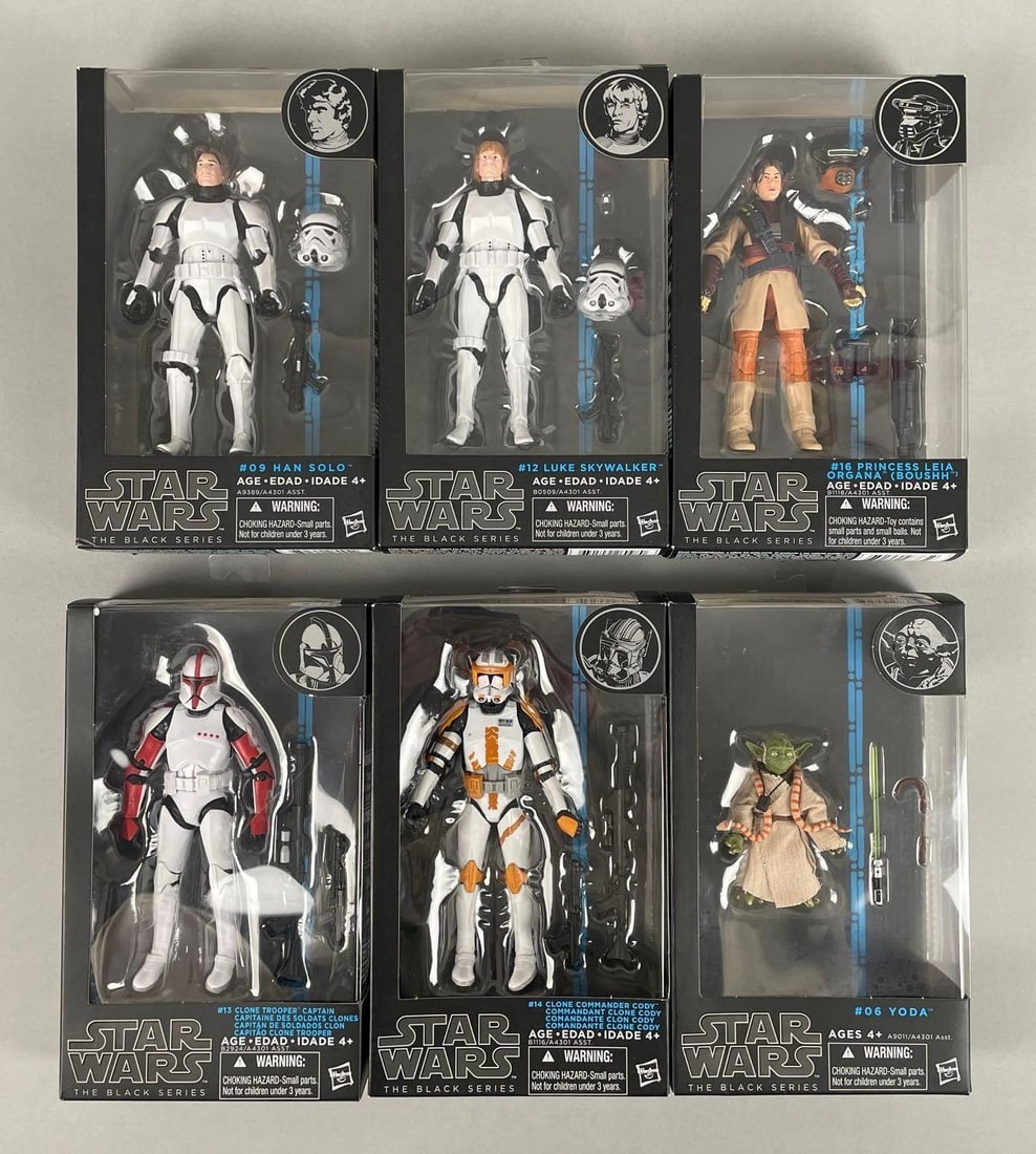 Three Star Wars The Black Series Kylo Ren Action Figures, including the 2016 SDCC Exclusive UnmaskedA group of three collectible plastic action figures from the 'Star Wars The Black Series' line by Hasbro, each featuring the character Kylo Ren and presented in their original cardboard packaging. The