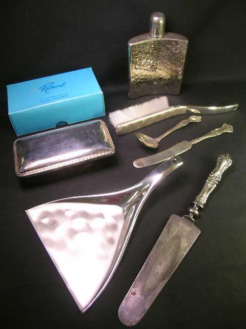 GRP SILVER PLATE KNIVES SPOONS DUMB WAITERS FLASK