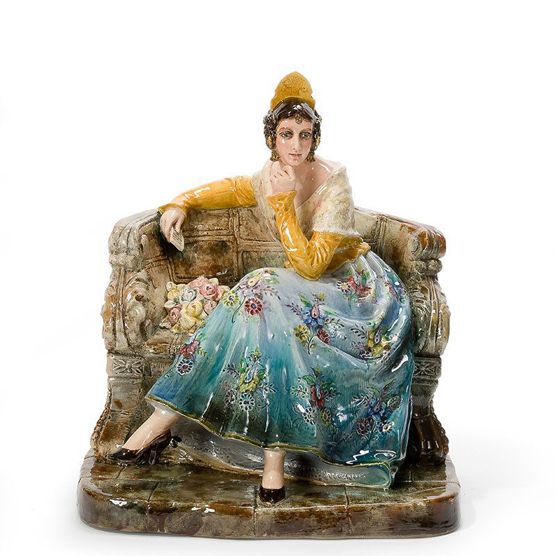Suonatrice di tamburello, scultura in maiolica,