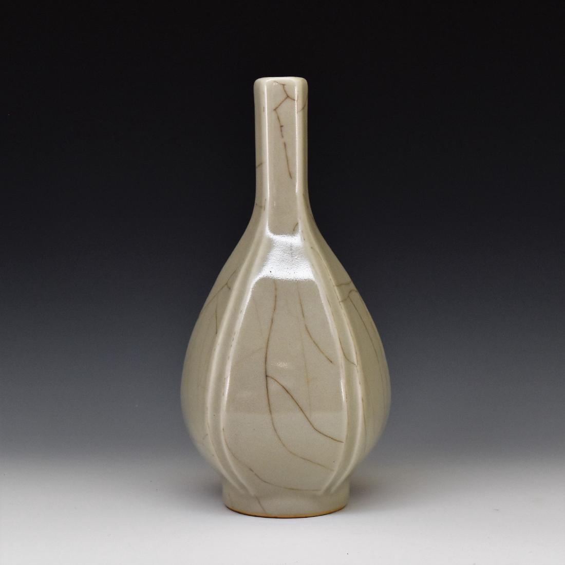 SoldChinese Guan-type Bottle VaseChinese Guan-type ceramic bottle vase, the cylindrical neck splayed toward the pear shaped body, raised on a low foot, 6.75"hSee Sold Price