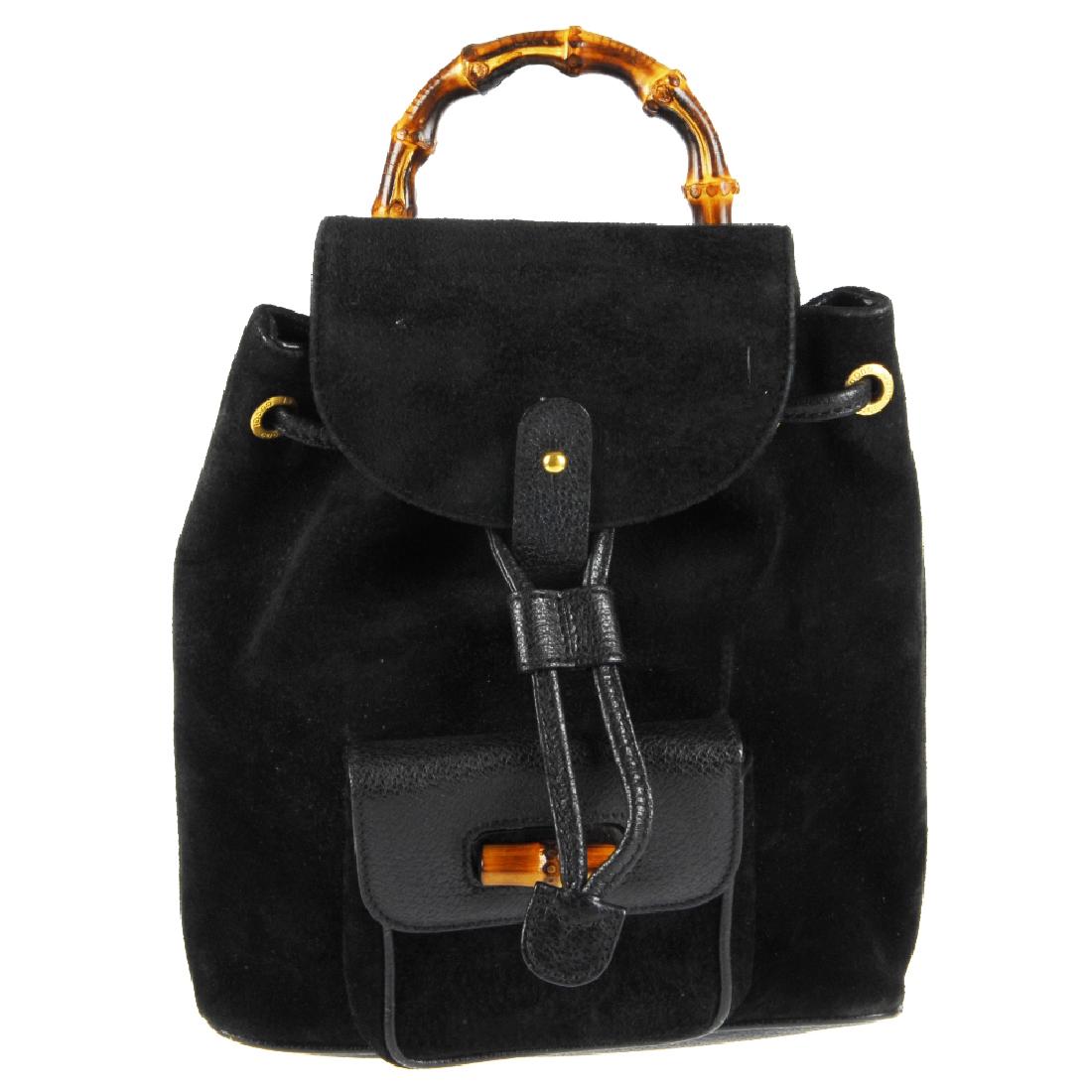 SoldGUCCI BLACK SUEDE BAMBOO ACCENTED BACKPACKGucci bamboo backpack, in black suede, with gold-tone hardware, single bamboo top handle, dual flat adjustable back straps, two exterior front pockets, top with buckle closure, over additional drawstrSee Sold Price