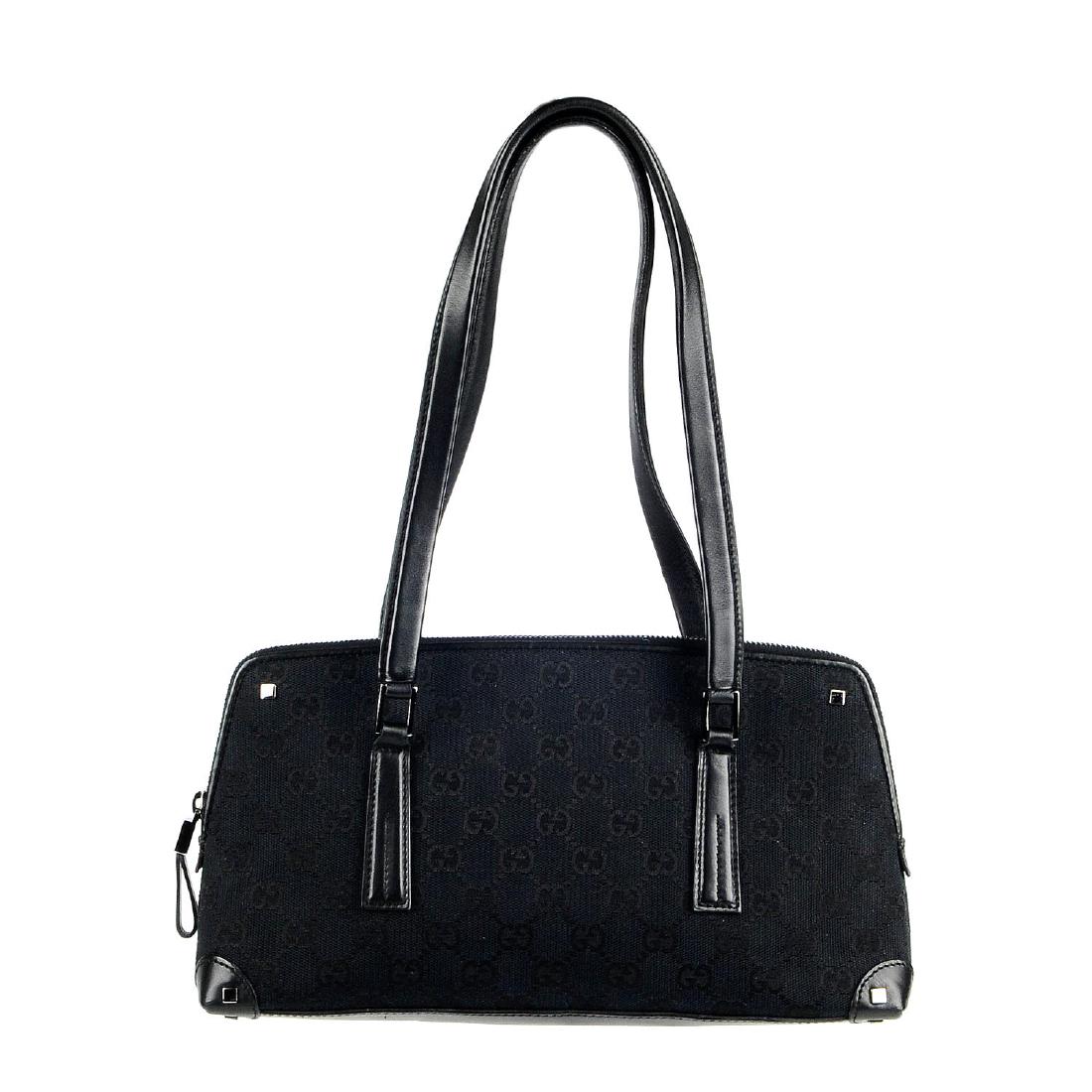 SoldGUCCI - a Jackie handbag. Designed with a black GGGUCCI - a Jackie handbag. Designed with a black GG canvas exterior and smooth black leather trim, flat handle with buckle side detail, polished gunmetal hardware and a front piston-lock fastening. MeaSee Sold Price